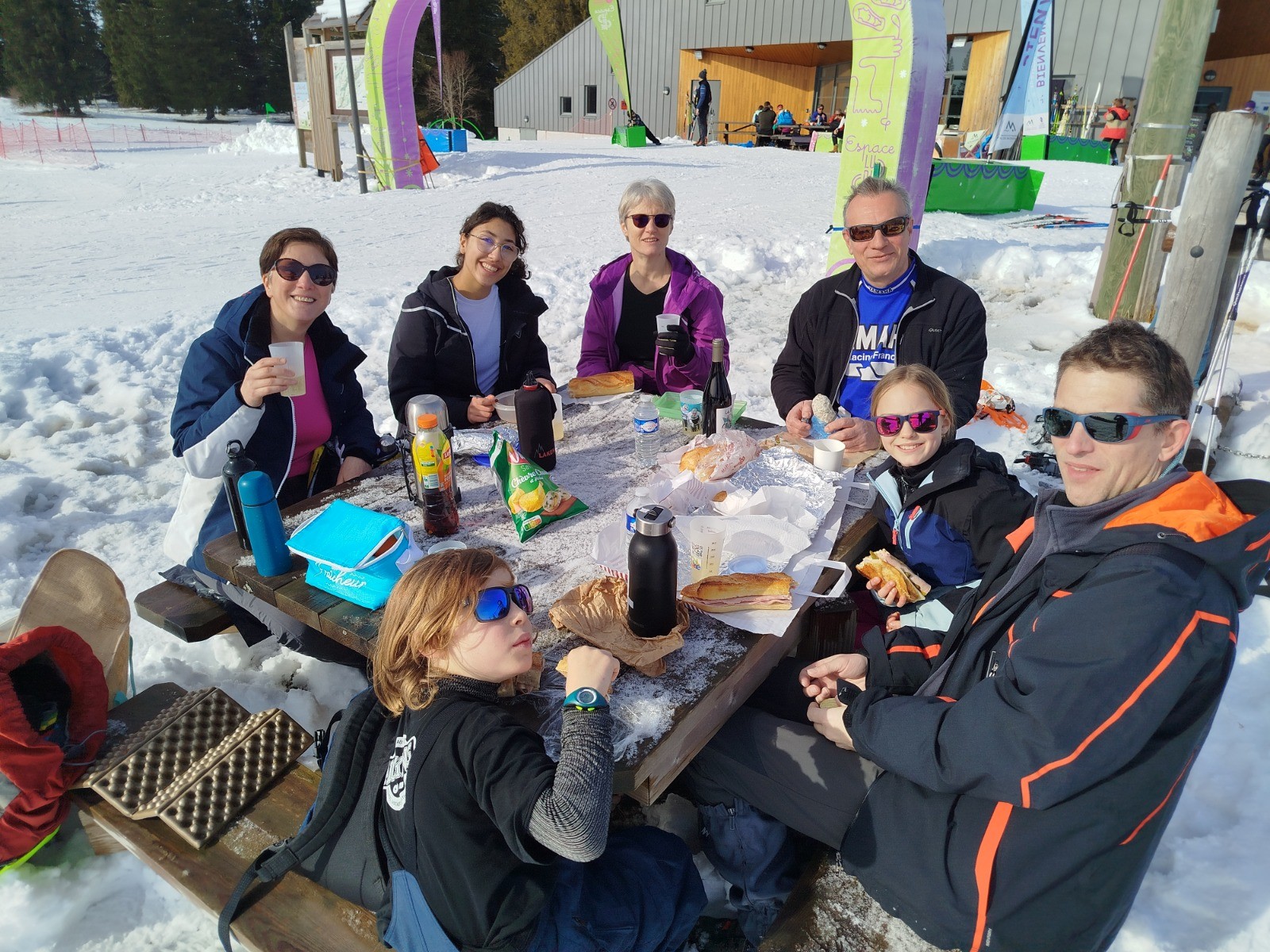 De retour au « camp de base » après avoir déneigé une table de pique-nique, nous partageons un bon casse-croûte !